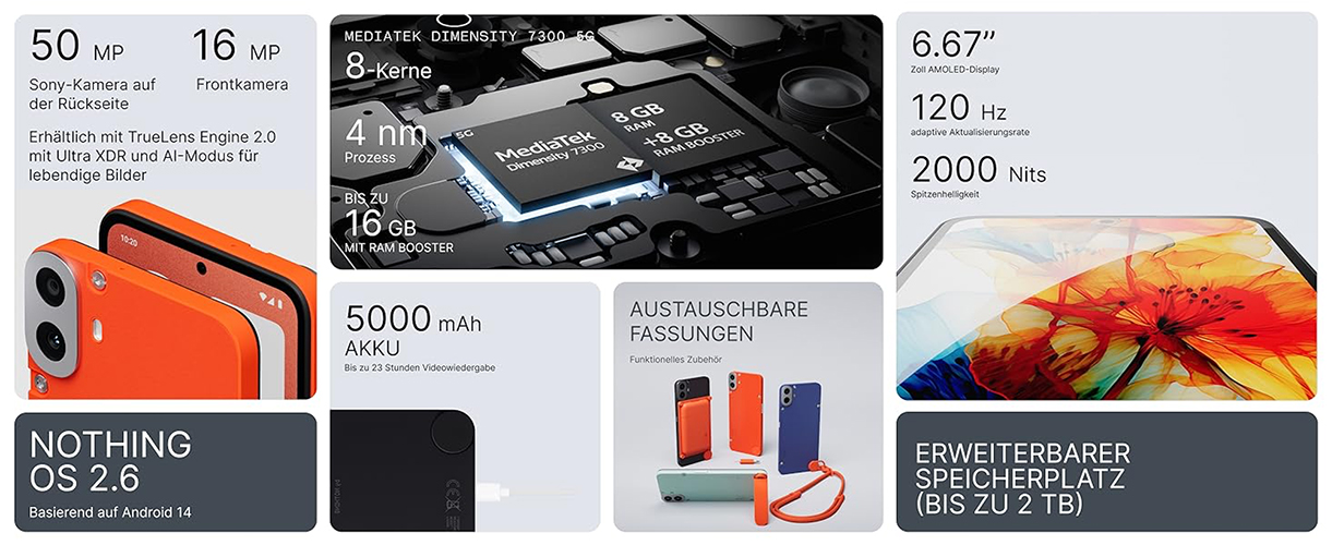 Ausgestattet mit dem aktuellen Nothing OS 2.6 auf Basis von Android 14 erhalten Sie ein modernes Betriebssystem mit garantierten wichtigen Android-Updates für zwei Jahre sowie Sicherheitsupdates für drei Jahre – so bleibt Ihr Smartphone stets sicher und aktuell.