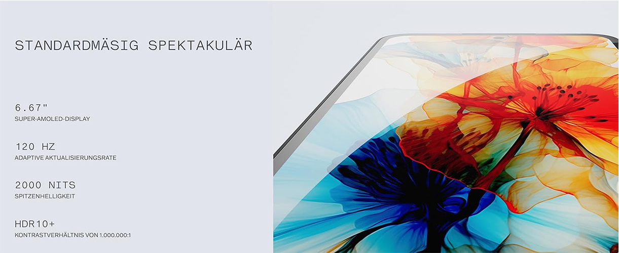 Das brillante 6,67 Zoll große Super AMOLED LTPS-Display besticht durch eine Auflösung von 1080 x 2400 Pixeln (395 PPI) und eine beeindruckende Farbtiefe von 8 Bit. Mit einem Kontrastverhältnis von 1.000.000:1 sowie einer adaptiven Bildwiederholrate von bis zu 120 Hz sorgt das Display für lebendige Farben und butterweiche Animationen. Die Spitzenhelligkeit von bis zu 2000 Nits garantiert selbst bei direkter Sonneneinstrahlung ausgezeichnete Sichtbarkeit, während die robuste Dragontail Pro Glass Oberfläche für zuverlässigen Schutz sorgt.