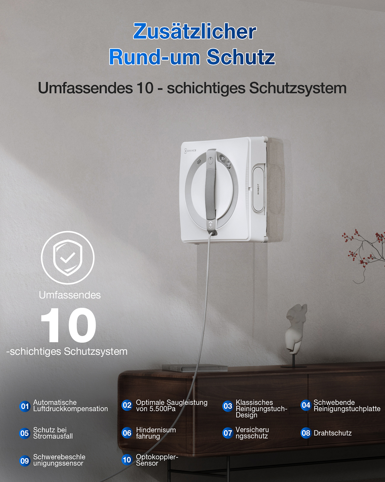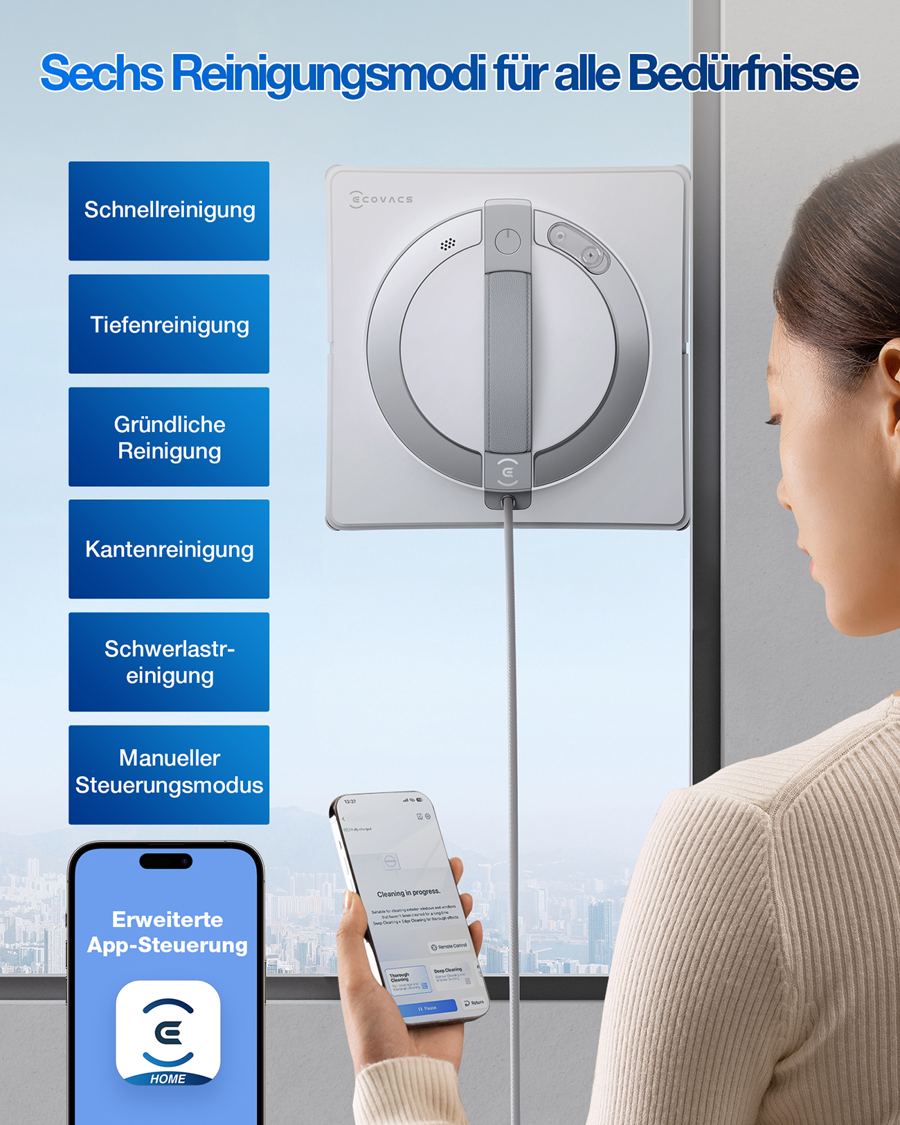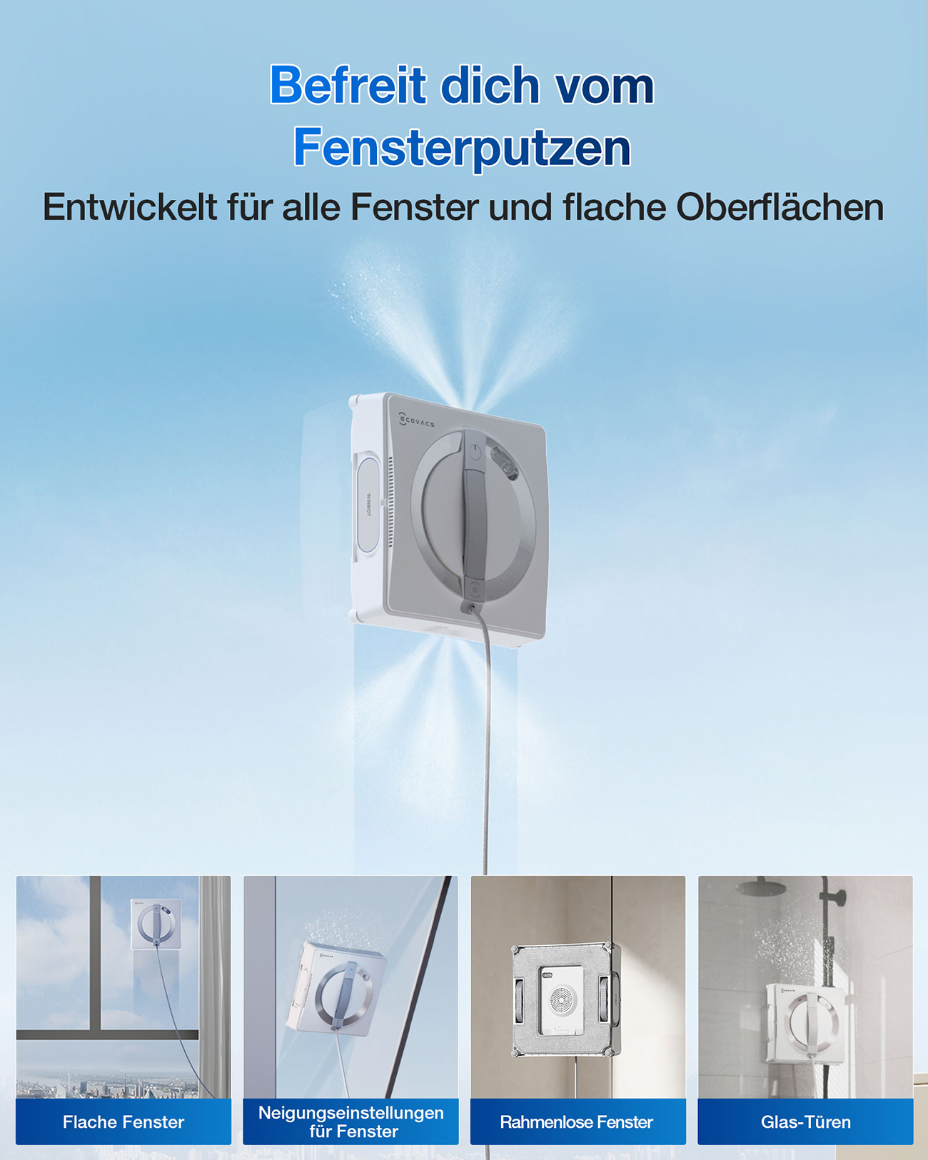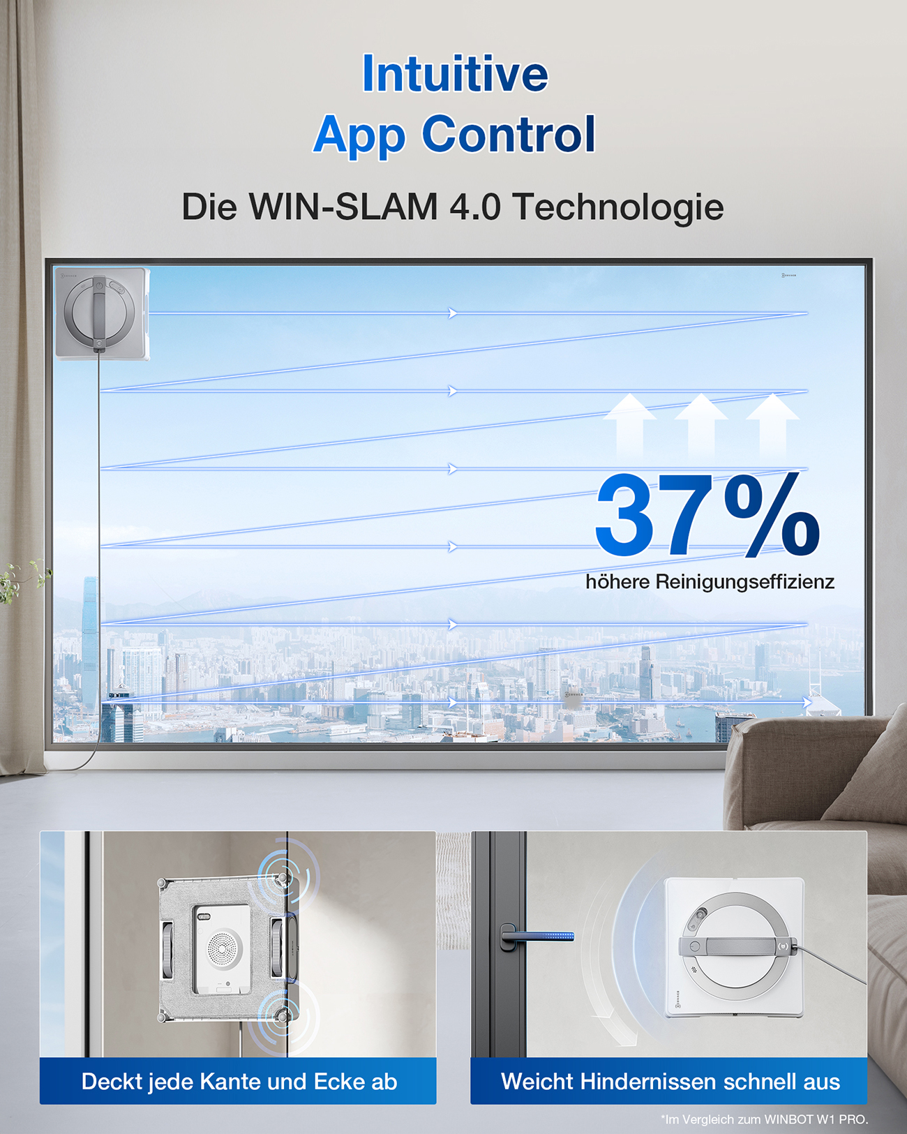 Der Winbot W2 Pro spricht Ihre Sinne an und schafft eine Atmosphäre der Leichtigkeit und Sauberkeit in Ihrem Zuhause oder Büro. Das Gefühl, durch blitzblanke Fenster den Ausblick ungestört zu genießen und gleichzeitig die Gewissheit zu haben, dass ein ausgeklügeltes Hightech-System mit intelligenter Routenplanung und automatischer Sprühfunktion für makellose Ergebnisse sorgt, ist einfach unvergleichlich. Es ist mehr als nur ein Reinigungsgerät – es ist Ihr persönlicher Helfer für mehr Lebensqualität.