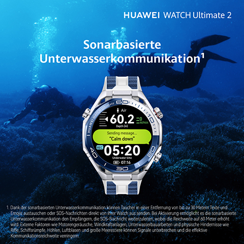 Für alle, die gerne abtauchen: Diese Smartwatch ist der absolute Hammer! Sie bietet branchenweit als erste sonarbasierte Unterwasserkommunikation – das heißt, du kannst unter Wasser mit anderen Tauchern kommunizieren, ohne dein Handy zu brauchen. Und das Beste: Die Uhr ist für Tauchtiefen bis zu 150 Metern ausgelegt – das ist weit über dem Standard anderer Smartwatches! Egal, ob du Hobbytaucher oder Profi bist, die HUAWEI WATCH Ultimate 2 begleitet dich sicher und smart in die Tiefen.