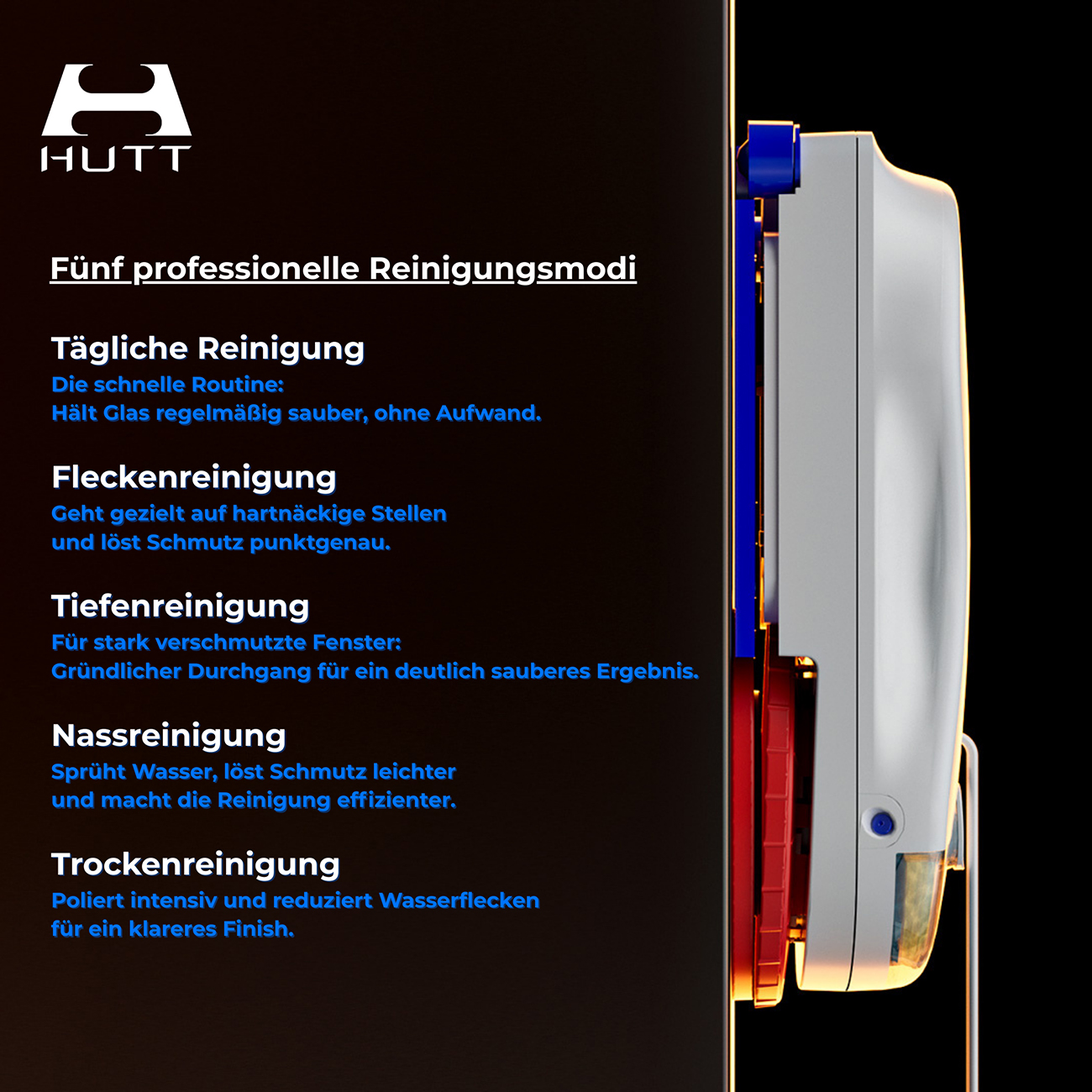 Was den Hutt 10 einzigartig macht, ist seine Dual-Modus-Reinigung mit eckiger und runder Form, die selbst schwer zugängliche Ecken ohne Aufwand erreicht. Die speziell entwickelte Dual-Mode-Klettertechnologie sorgt dafür, dass das Gerät mühelos an kleinen und schmalen Fenstern haftet und bewegt wird – ganz gleich ob vertikal oder horizontal. Das kegelförmige Puls-Sprühsystem verteilt Reinigungsmittel präzise und effizient, während das 3D-Schwebefahrwerk mit intelligenter Kantenerkennung ein sicheres Navigieren entlang der Fensterrahmen gewährleistet. Mit fünf professionellen Reinigungsmodi passt sich der Hutt 10 individuell Ihren Bedürfnissen an – ob schnelle Auffrischung oder gründliche Tiefenreinigung. Die bequeme Steuerung per Fernbedienung ermöglicht es Ihnen, den Reinigungsprozess jederzeit komfortabel zu kontrollieren.