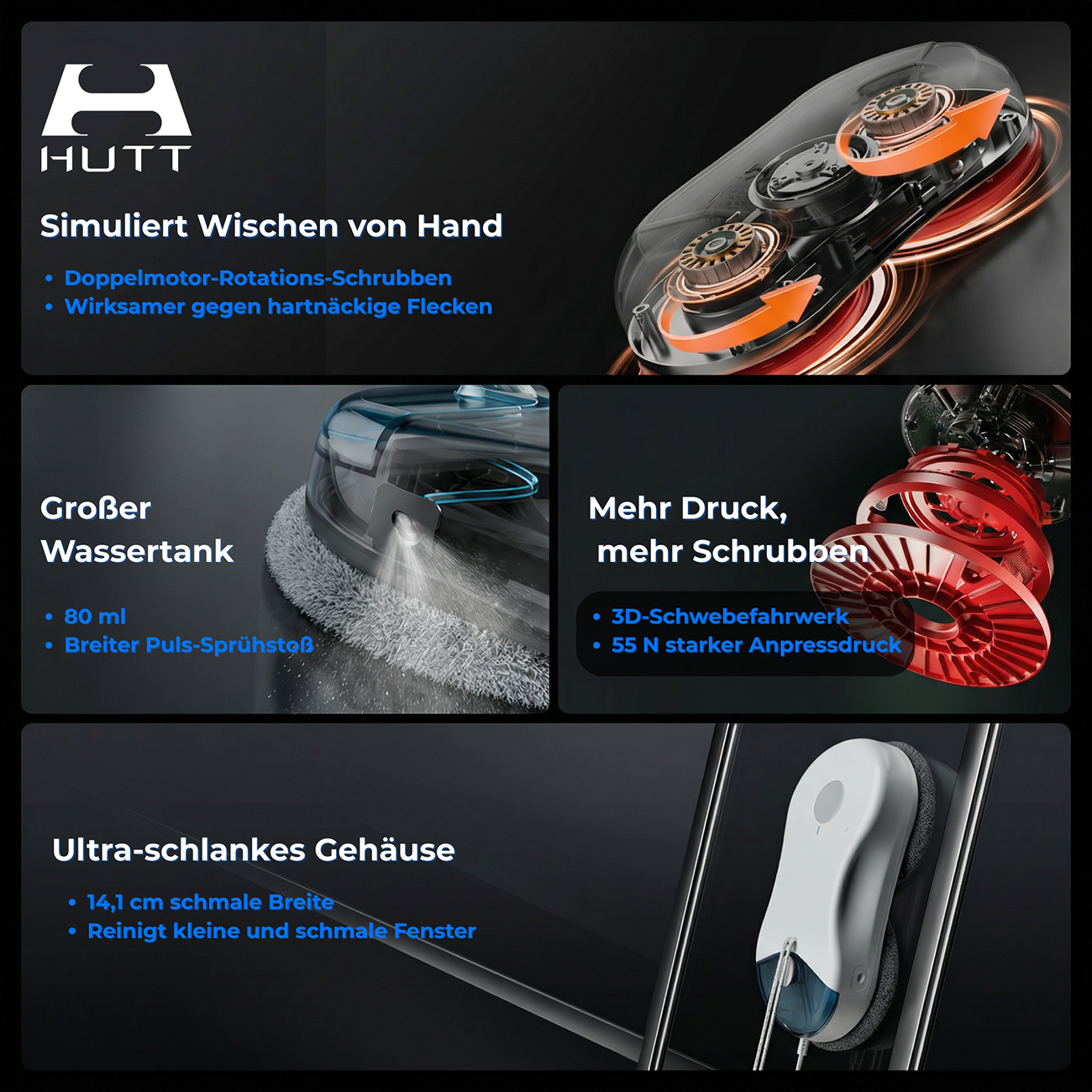 Der Hutt DDC55PRO revolutioniert Ihre Fensterreinigung und schenkt Ihnen Zeit und Mühe, die Sie besser für die schönen Dinge im Leben nutzen können. Stellen Sie sich vor, wie Ihre Fenster in makellosem Glanz erstrahlen, ohne dass Sie einen Finger rühren müssen – so gelingt es Ihnen, Ihr Zuhause oder Ihr Büro stets in bestem Licht zu präsentieren und dabei den Alltag stressfrei zu gestalten.