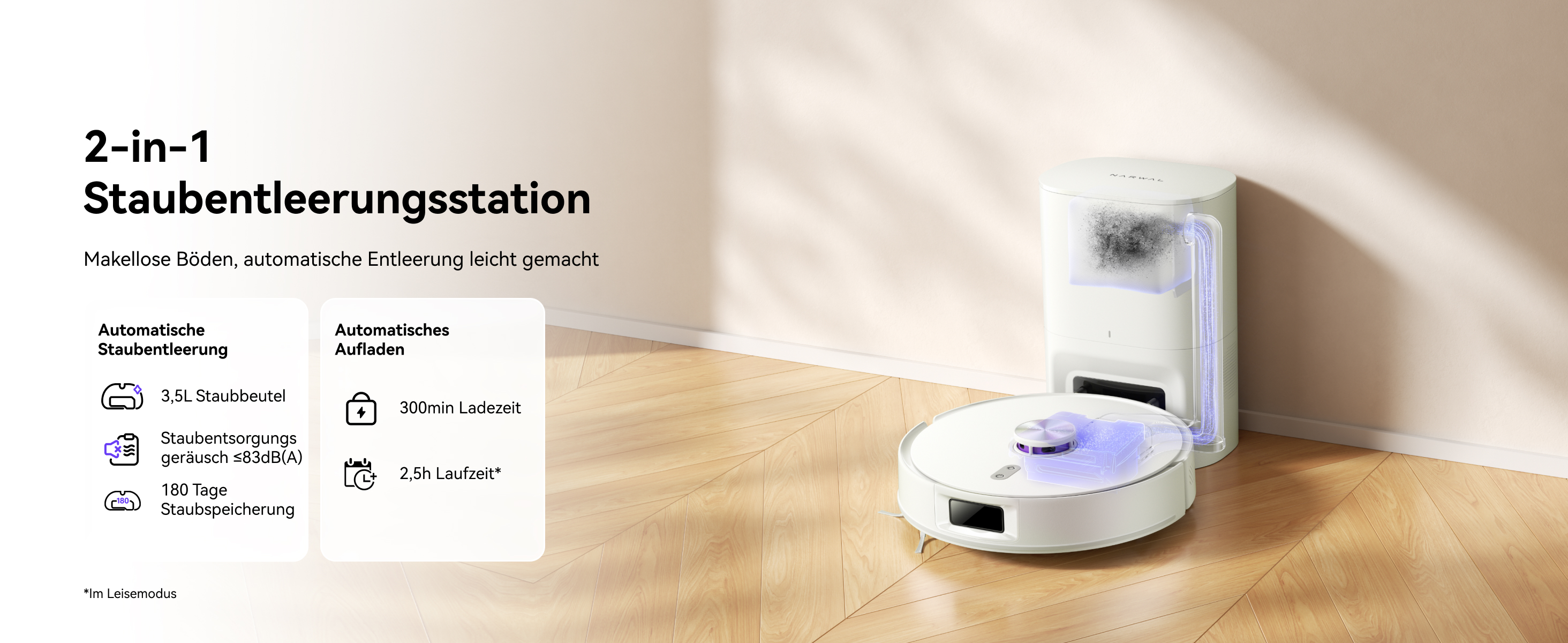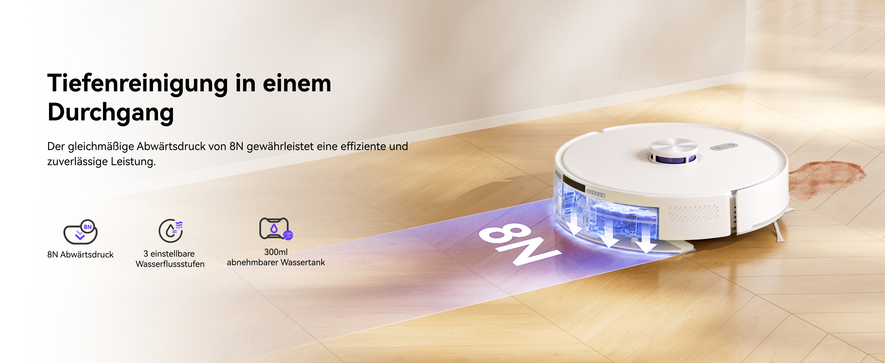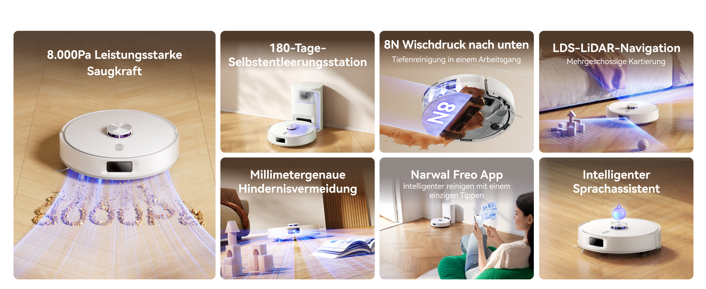 Was den Narwal Freo S. so einzigartig macht, sind seine innovativen Technologien und durchdachten Funktionen: Das Staubsaug-Dock mit einer Kapazität für bis zu 180 Tage und einem großzügigen 3,5-Liter-Staubbeutel garantiert langanhaltende Sauberkeit ohne häufiges Entleeren. Die präzise LiDAR-Navigation mit LDS-Lasern sowie 3D-Mapping ermöglicht eine millimetergenaue Hinderniserkennung und effiziente Routenplanung. Mit einem kraftvollen Reinigungsdruck von 8 N und einem abnehmbaren 300-ml-Wassertank, dessen Wasserstrahl in drei Stufen regulierbar ist, meistert der Freo S. sowohl das Saugen als auch das Wischen auf Teppichen und glatten Böden – selbst Tierhaare stellen kein Problem dar.